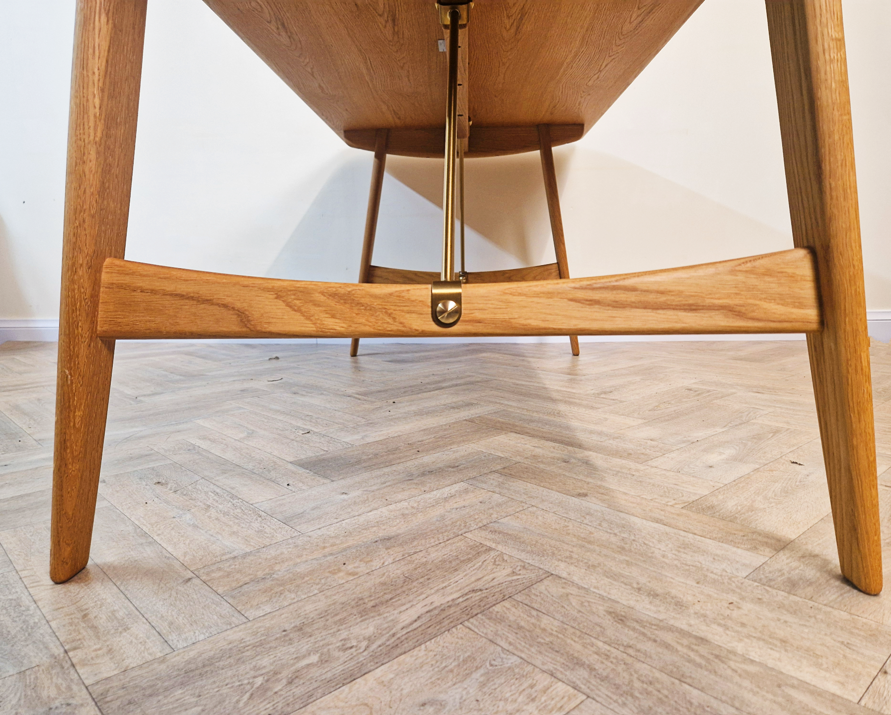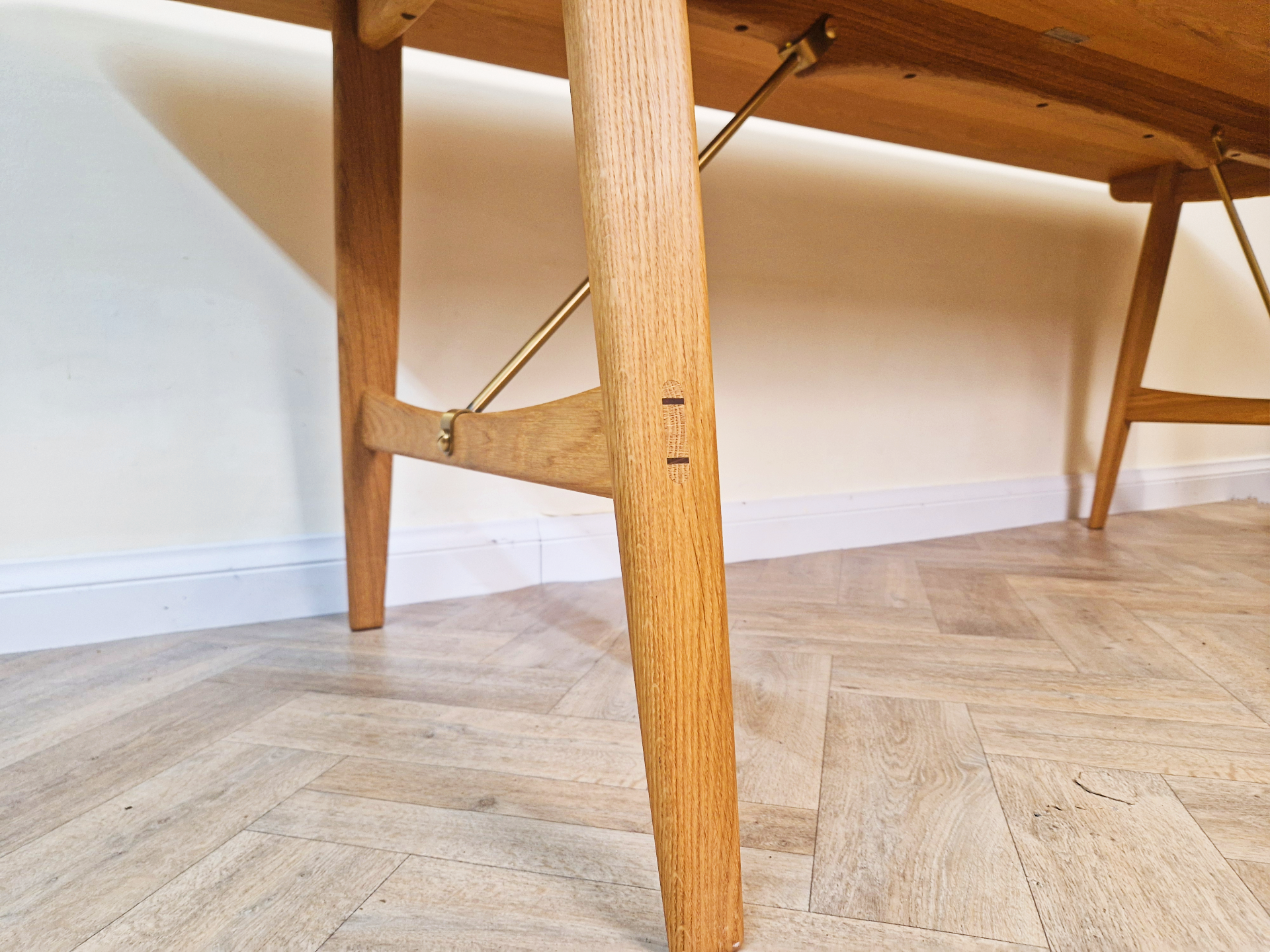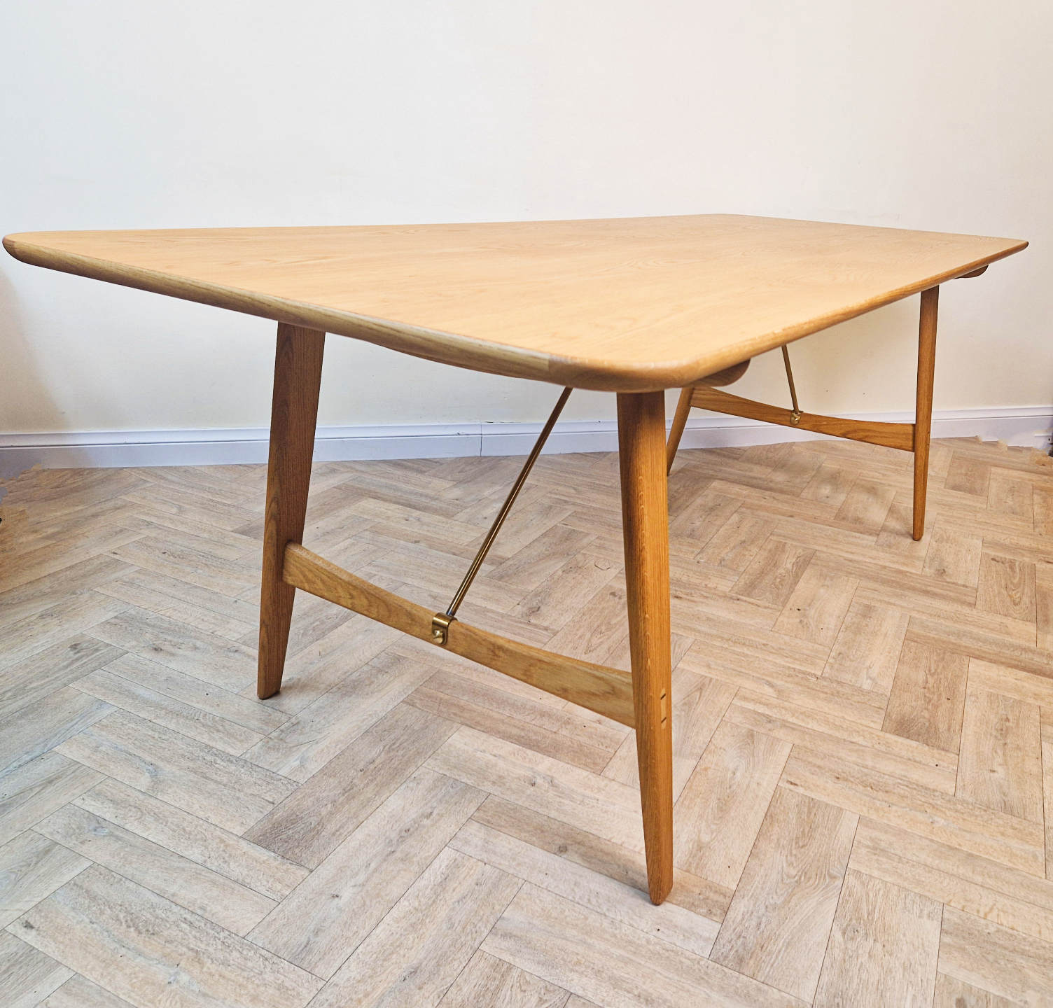 A stunning handcrafted dining table by Børge Mogensen, where premium materials meet masterful Danish design. Balancing refined solid wood construction with elegant brass details, this functional piece creates an inviting centerpiece for both everyday meals and special gatherings.