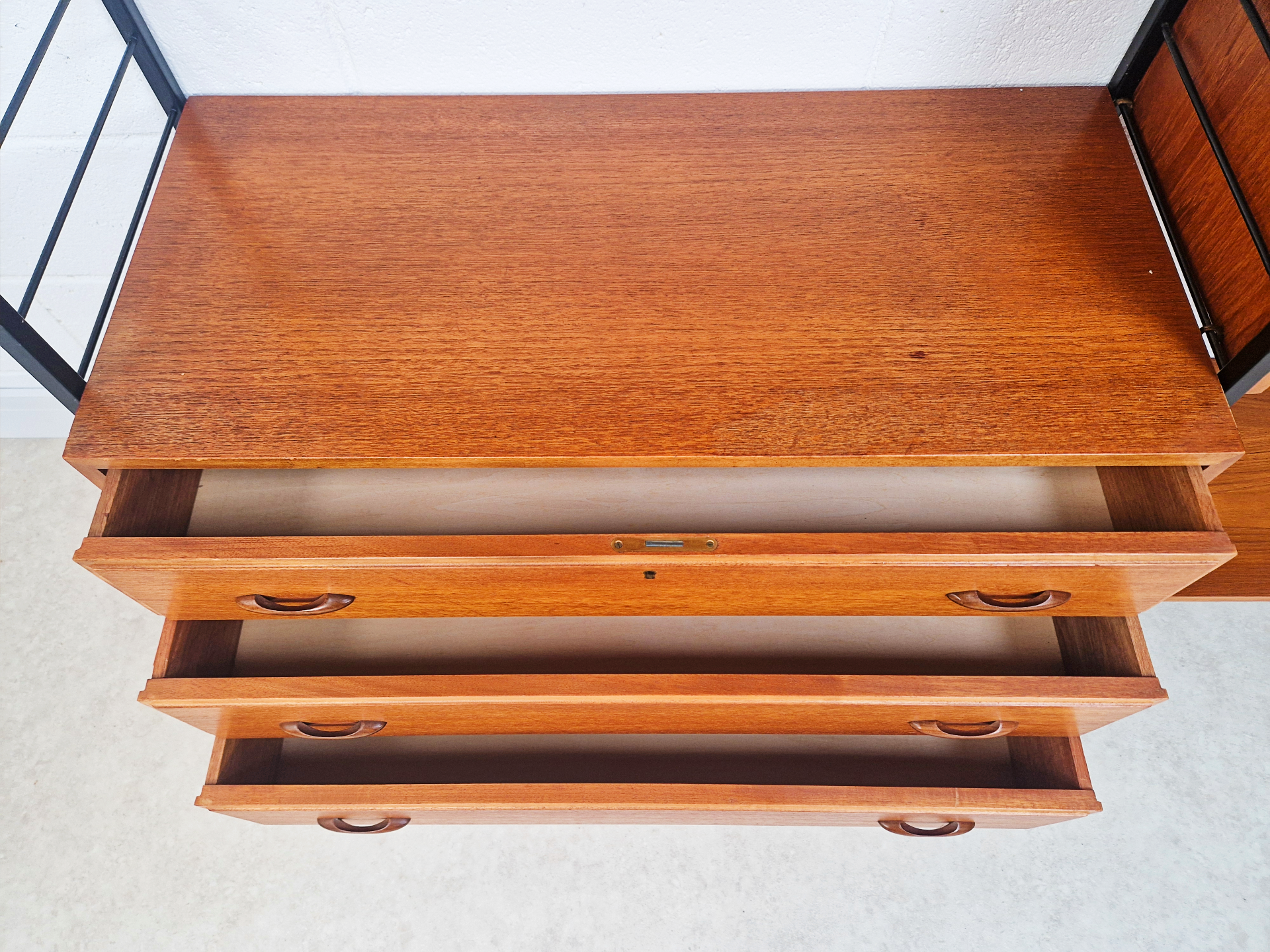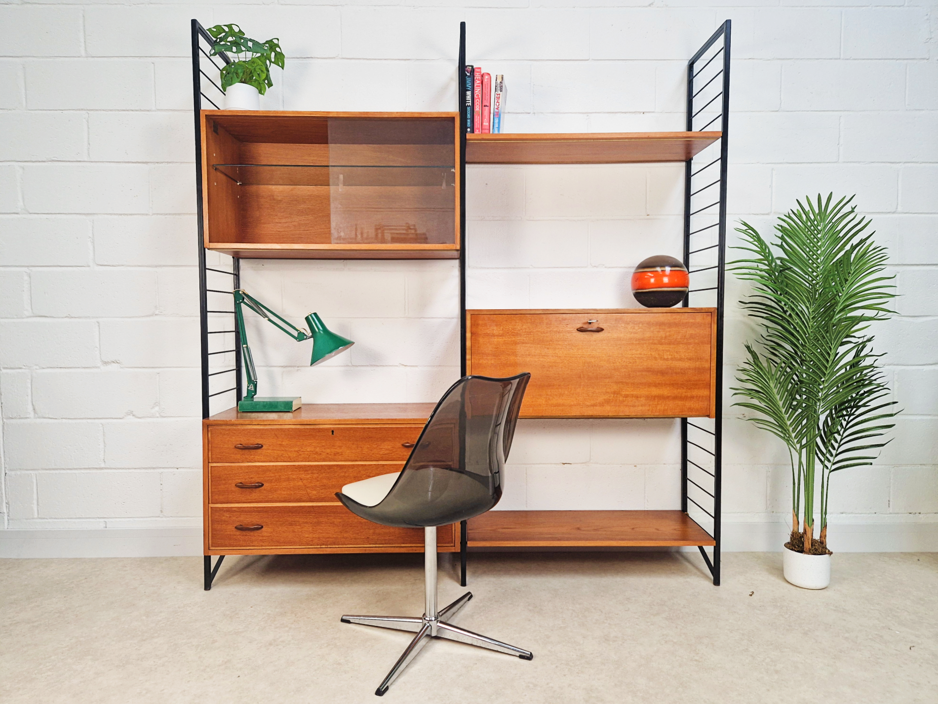 This stunning Ladderax modular system includes two bays with three cabinets: one with a drop-down door and key, one with glazed sliding doors, and one with three pull-out drawers, plus three adjustable shelves. Designed for ultimate flexibility, the components can be arranged in any configuration to perfectly suit your space and storage needs—a blend of mid-century-inspired design and modern adaptability.